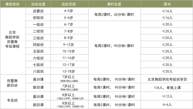 专业班: 为了让更多在业余时间学习、热爱芭蕾舞和有意向报考专业芭蕾舞院校的学生尽可能多的接触专业芭蕾舞课程,特开设了此班。本班以北京舞蹈学院芭蕾舞系附中教材为基准, 通过软开度、基本功、足尖和剧目课的强化训练,使学生达到准专业水平,并有一定实力参加国内、外各大芭蕾舞赛事。